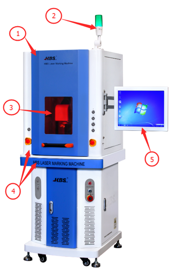 ② Voyant d'avertissement : le voyant d'avertissement a trois fonctions : lorsque la machine est prête pour le marquage ou que la procédure de marquage est terminée, le voyant devient vert ;lorsque la machine est en fonctionnement ou en marquage, la lumière devient orange ou jaune ;Lorsque la machine n'est pas fermée correctement (quelqu'un ouvre la porte lorsque la machine fonctionne) ou que la machine n'est pas sûre, le voyant devient rouge et une alarme se déclenche également.